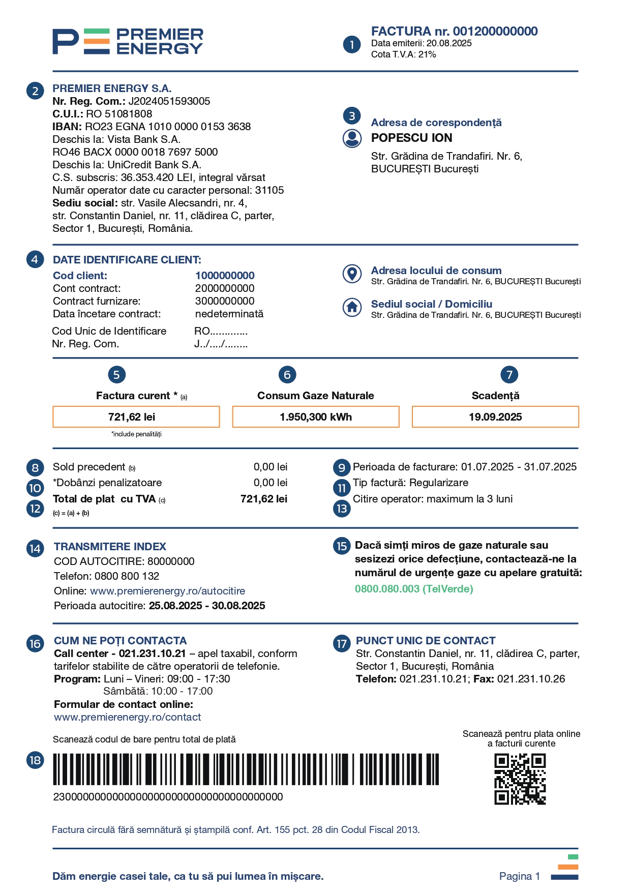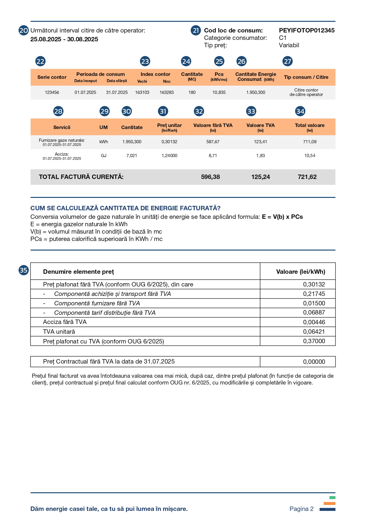 În rubrica denumită factura curentă vei găsi valoarea de plată a consumului de gaze naturale pentru perioada de facturare menționată pe factura actuală.